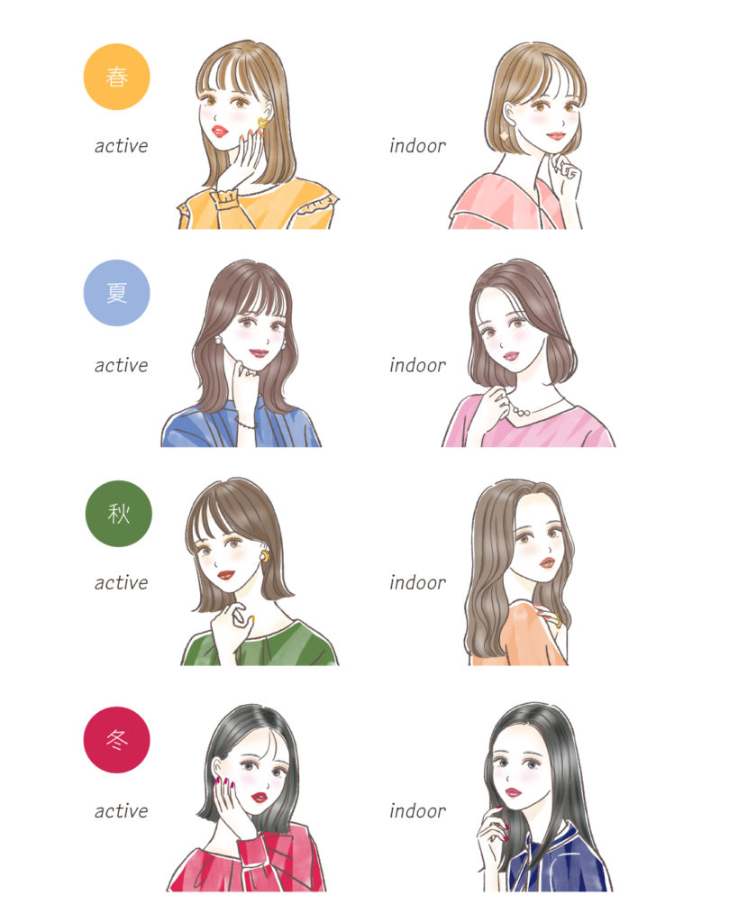 パーソナルカラー×性格 春顔メイク診断 WORK 2026.04.15 日本最大級のコスメ・化粧品・美容の総合情報サイト@cosmeにて『パーソナルカラー×性格 春顔メイク診断』のイラストを描かせていただきました。 パーソナルカラー、春・夏・秋・冬、それぞれアクティブ系とインドア系の2種のイラストです。
